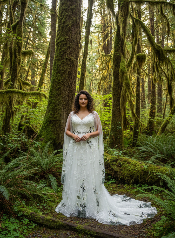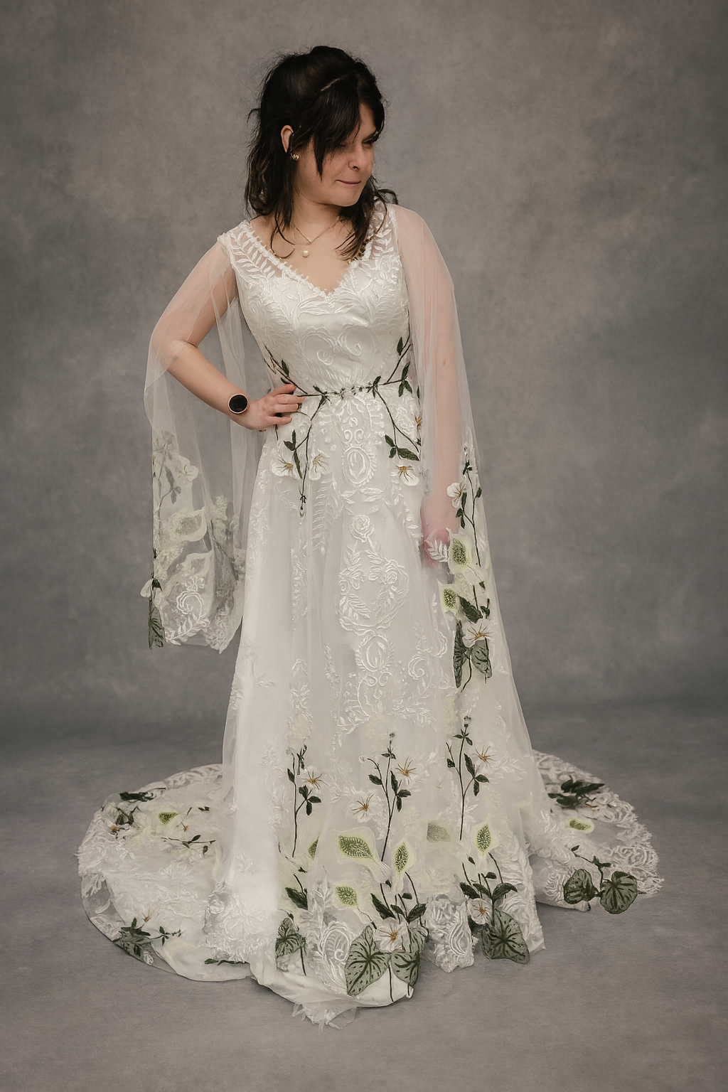 Crafted with intricate floral embroidery, soft botanical lace appliqués, and elegant sheer sleeves, this dress is a dreamy blend of ethereal beauty and modern bridal style. The full A-line skirt flows gracefully into a sweeping train adorned with blooming white and green florals, perfect for a garden wedding, forest ceremony, or outdoor celebration.