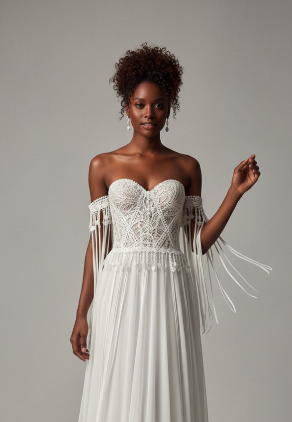 Bohemian, effortless, and beautifully textural, Rivia by Tatiana Kaplun is a modern bridal set designed for the bride who wants movement, versatility, and couture-inspired detail. This three-piece bridal ensemble allows you to create multiple looks in one: transform your ceremony look into a reception-ready style simply by removing layers.