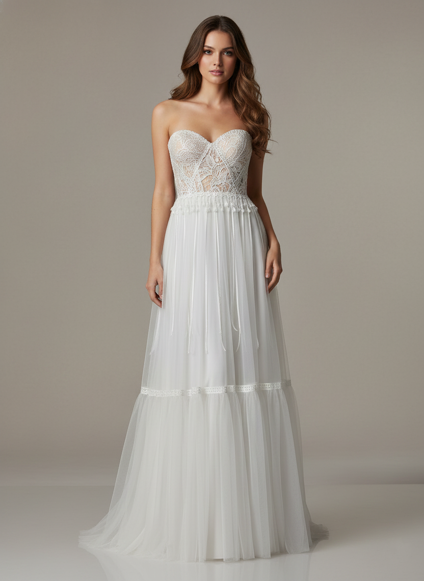 The structured lace corset top features intricate floral lace, soft boning, and long, slender fringe strands that create dreamy vertical movement. Its halter-inspired neckline adds a fashion-forward touch while maintaining a romantic feel.