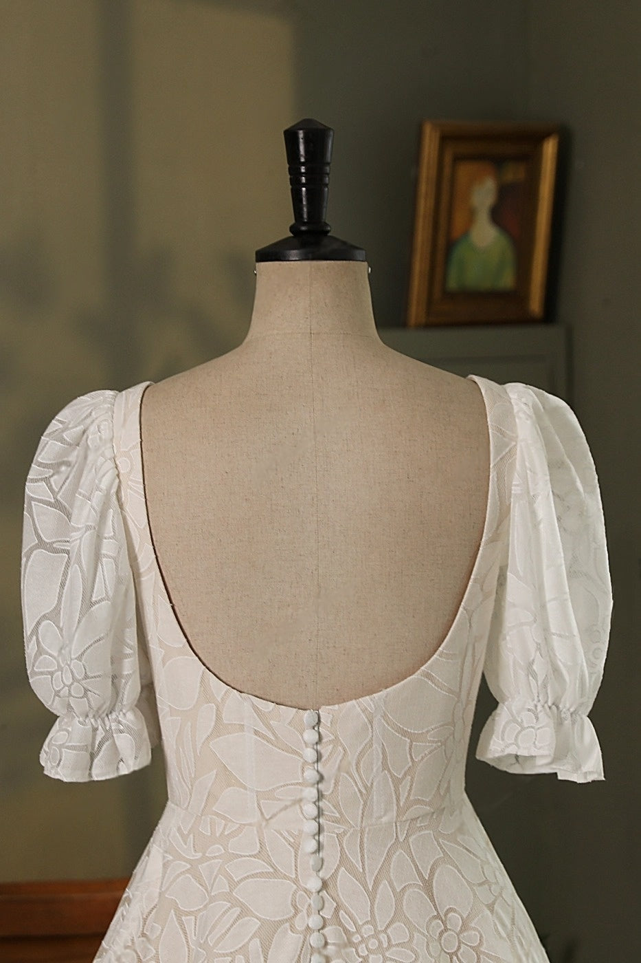 Step into a storybook romance with Rosalind, a timeless bridal gown that blends vintage elegance with graceful modernity. Featuring a structured square neckline, puffed short sleeves, and a sweeping a-line silhouette, Rosalind exudes femininity and poise. The soft ivory floral lace overlay creates a delicate texture, while the scoop back and button detailing add a charming touch of nostalgia.