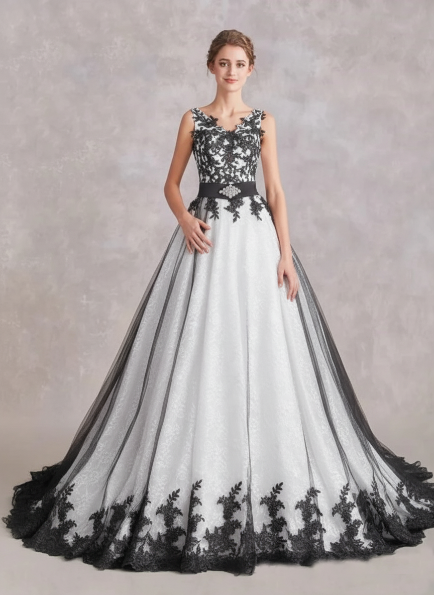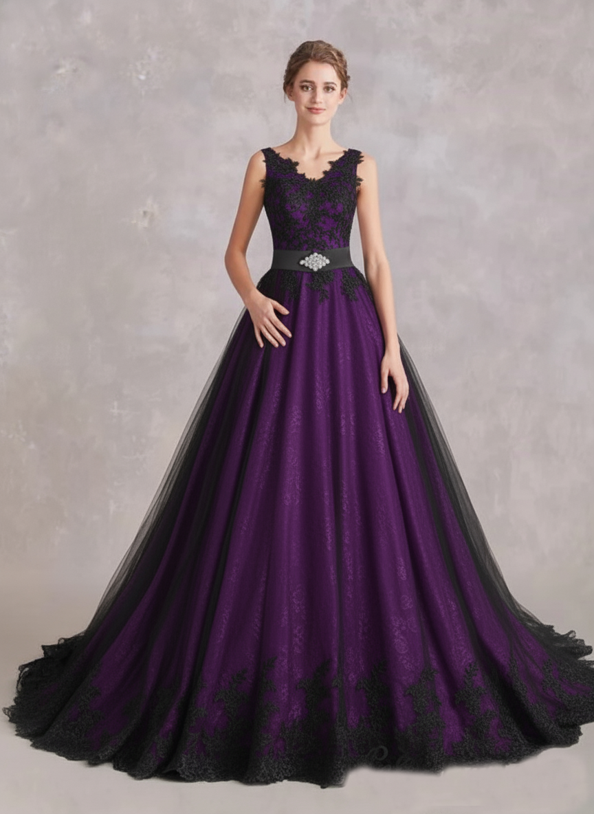 This black and dark red gothic wedding dress is made of lace and tulle. It is designed with lace bodice, V neck, and long satin sash.
