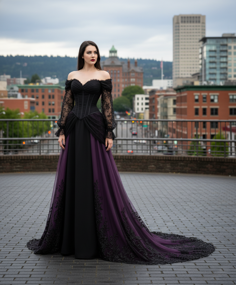 This couture-inspired gown features a structured black corset bodice with a romantic off-shoulder neckline, paired with sheer lace bishop sleeves for a touch of gothic Victorian drama. The A-line skirt flows into a sweeping chapel train, crafted in rich plum tulle over a black base, finished with embroidered black lace appliqué that trails like smoke behind every step.