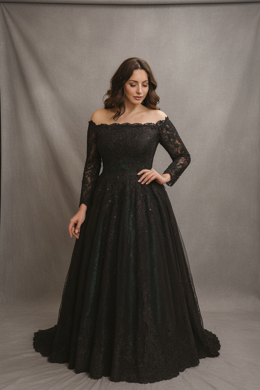 Step into your fairytale with the Shadowed Enchantment gown — a mesmerizing blend of gothic romance and ethereal elegance. This dramatic off-the-shoulder wedding dress features shimmering black lace layered over rich emerald green tulle, creating a captivating illusion of depth and color. The fitted corset bodice showcases delicate lace appliqués and a lace-up back for customizable comfort and shape.