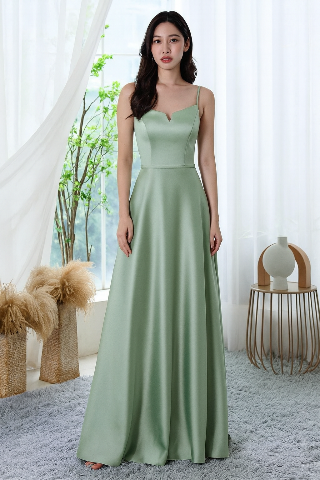 Lovely soft satin bridesmaid dress has a cool v-notch neck bodice with contouring seams and a banded waist. Our favorite part is the lovely lace 3-D leaves illusion back with leafy details.
