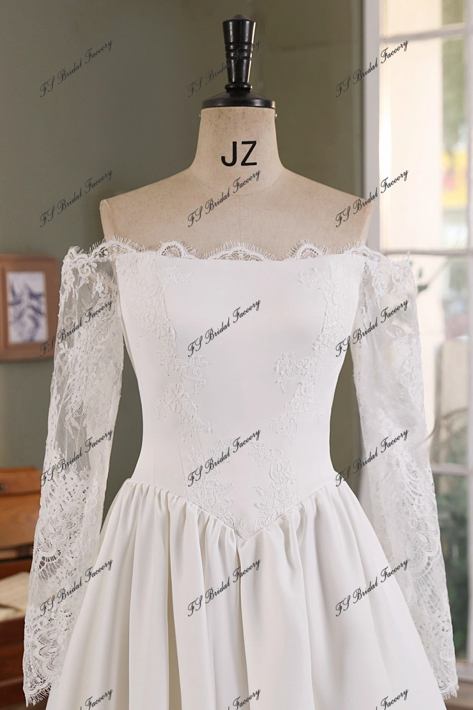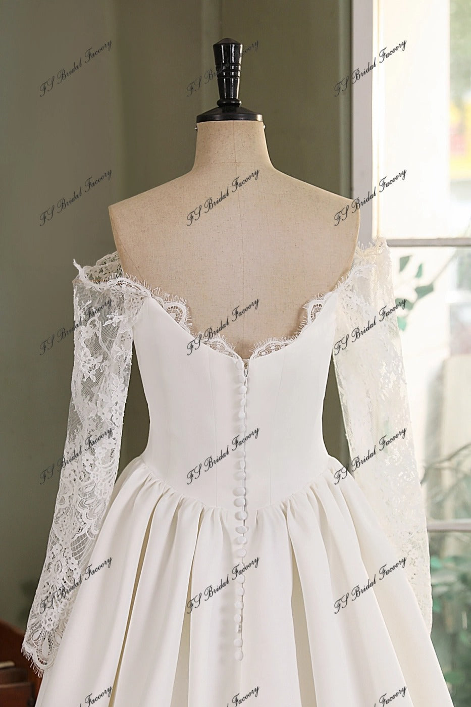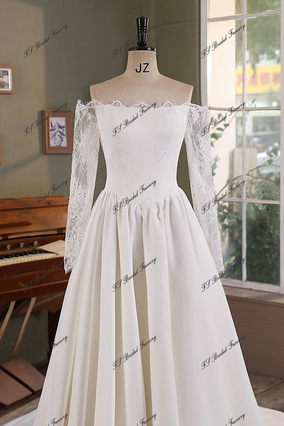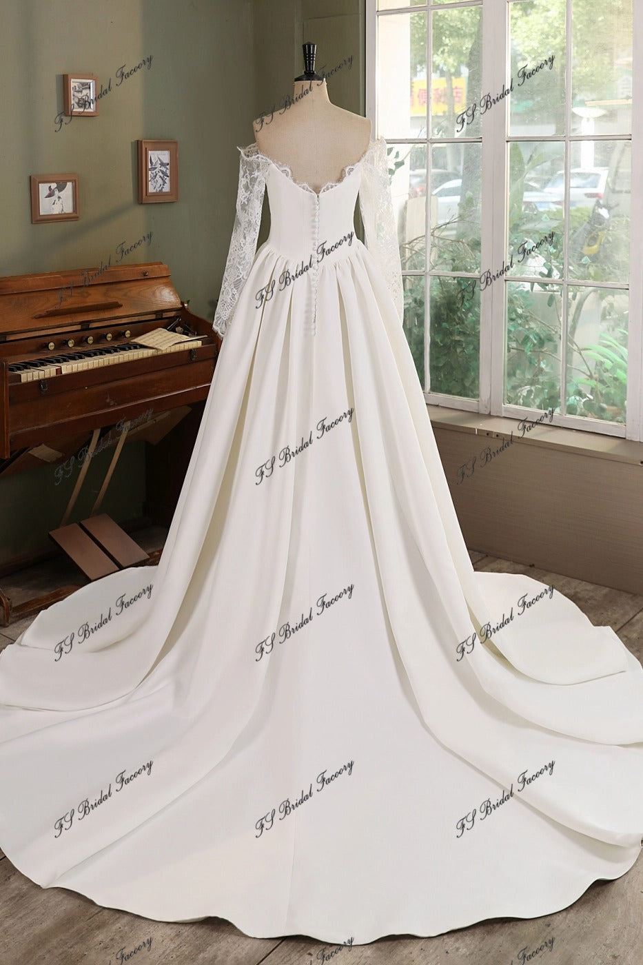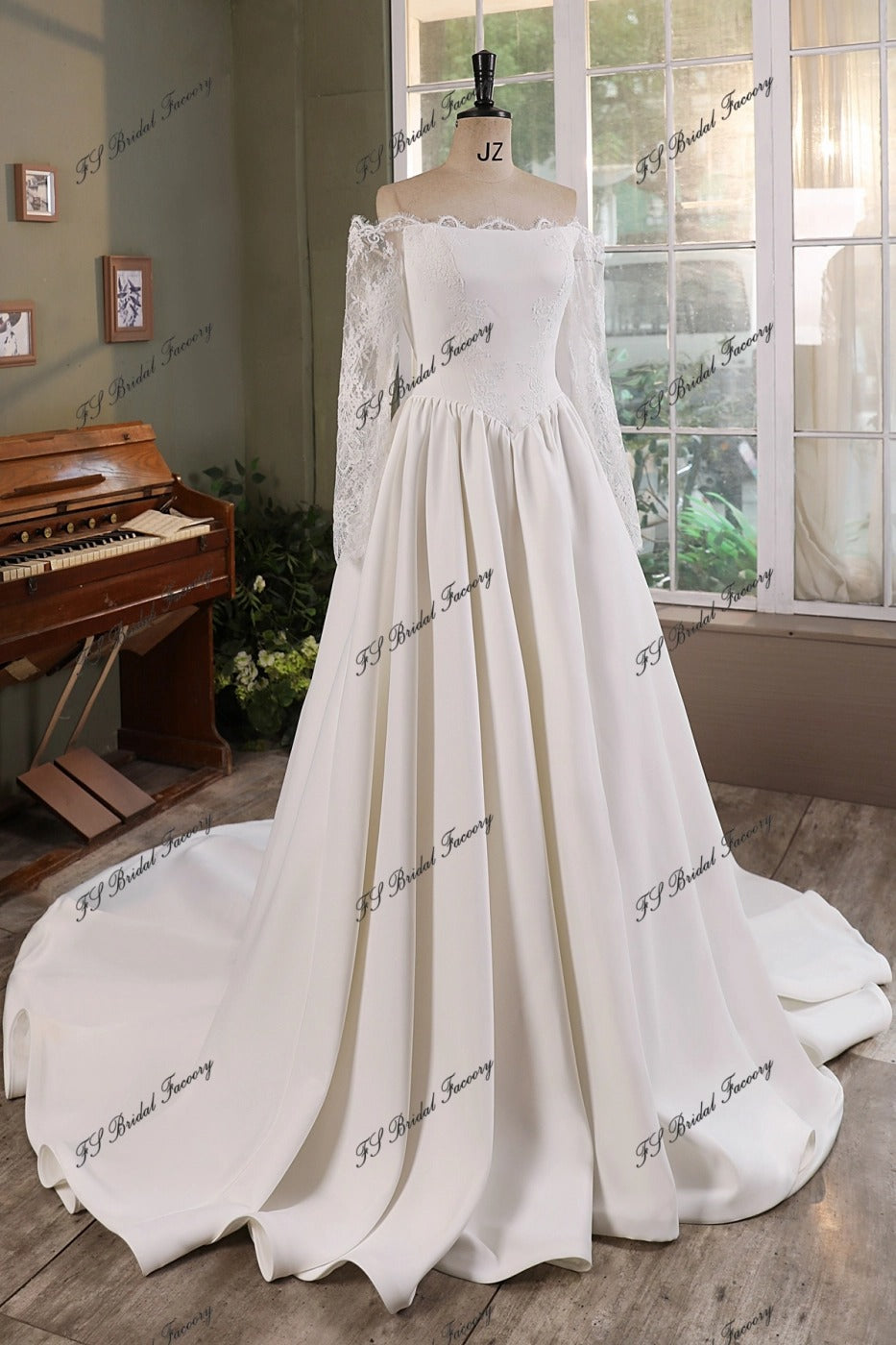 Tirza is a timeless ivory wedding gown that blends romantic lace with the clean elegance of satin. Designed with an off-the-shoulder neckline and long lace sleeves, this gown offers a soft, feminine look with classic bridal structure.