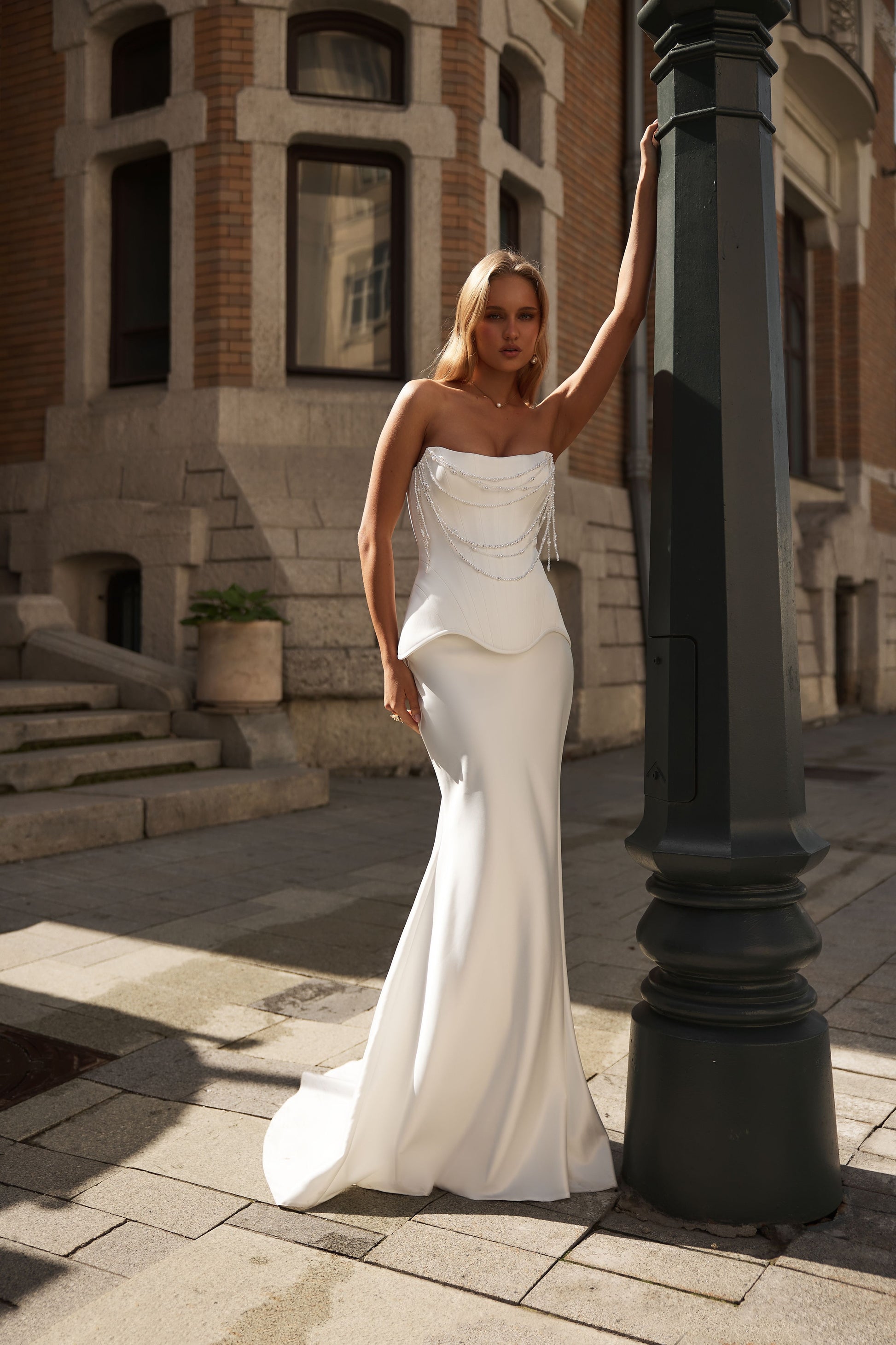 Sleek, sculptural, and undeniably modern — the Tubby gown by Sonya Soley, a Natalia Romanova company, redefines minimalist luxury. This captivating design is available as a complete set, or as separate corset and skirt pieces, giving brides the freedom to customize their look.