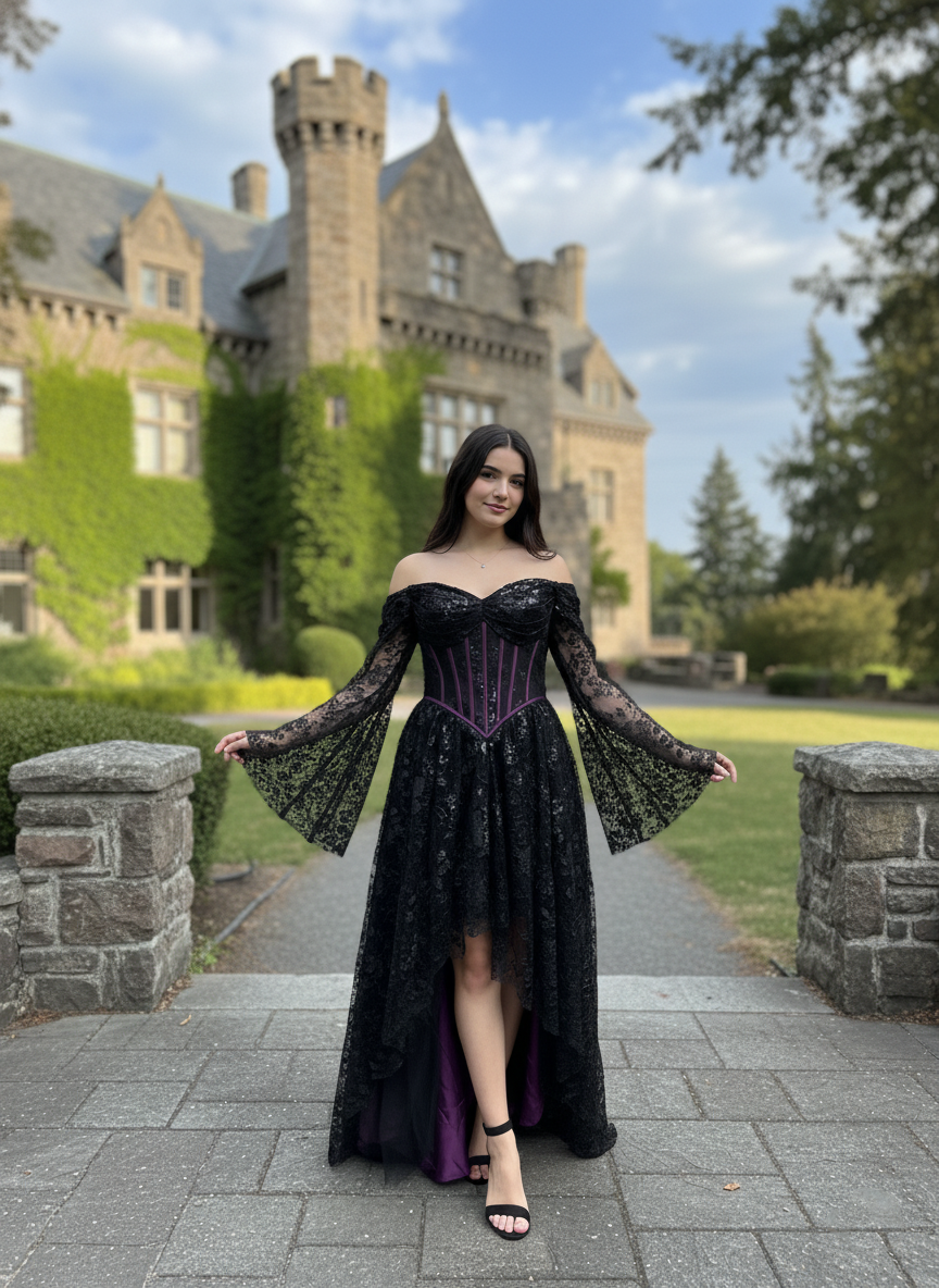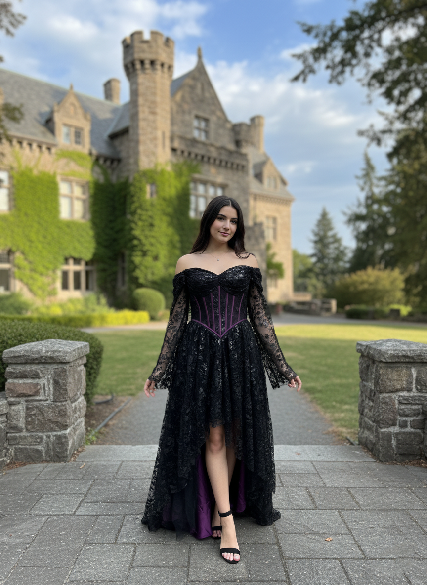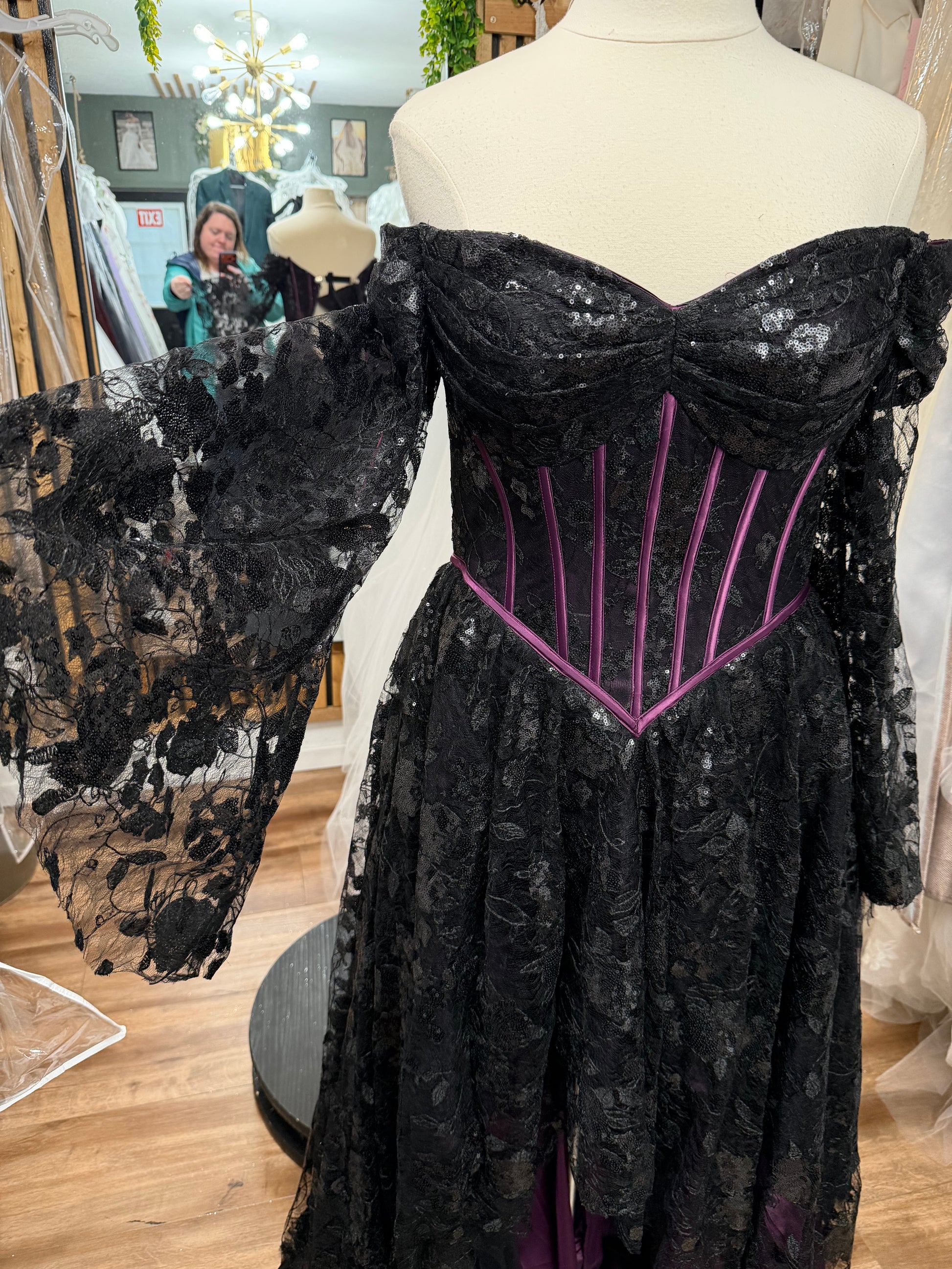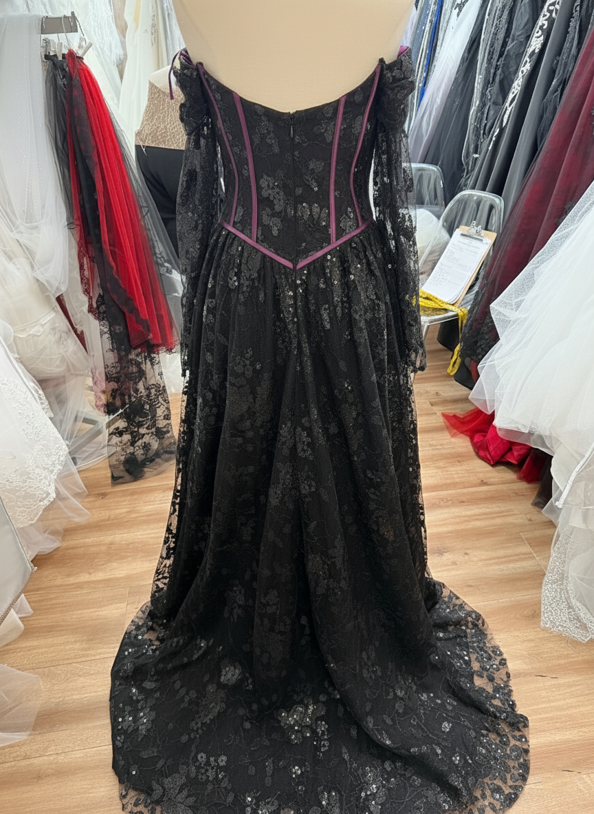 The skirt is crafted from layered black sequin-embroidered lace that catches the light in shimmering, moonlit glimmers. Beneath the cascading lace, a rich amethyst underlayer adds dimension and mystery—creating a bold, enchanted-forest glow with every step. The high-low hemline in front beautifully showcases your movement, while the sweeping train in back brings full gothic-drama energy to your aisle moment.
