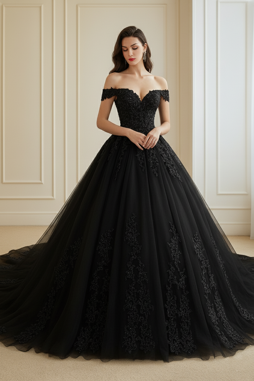 Ideal for brides searching for a black and white wedding dress, gothic ball gown, or off-the-shoulder lace bridal gown with a dramatic train and customizable color options.