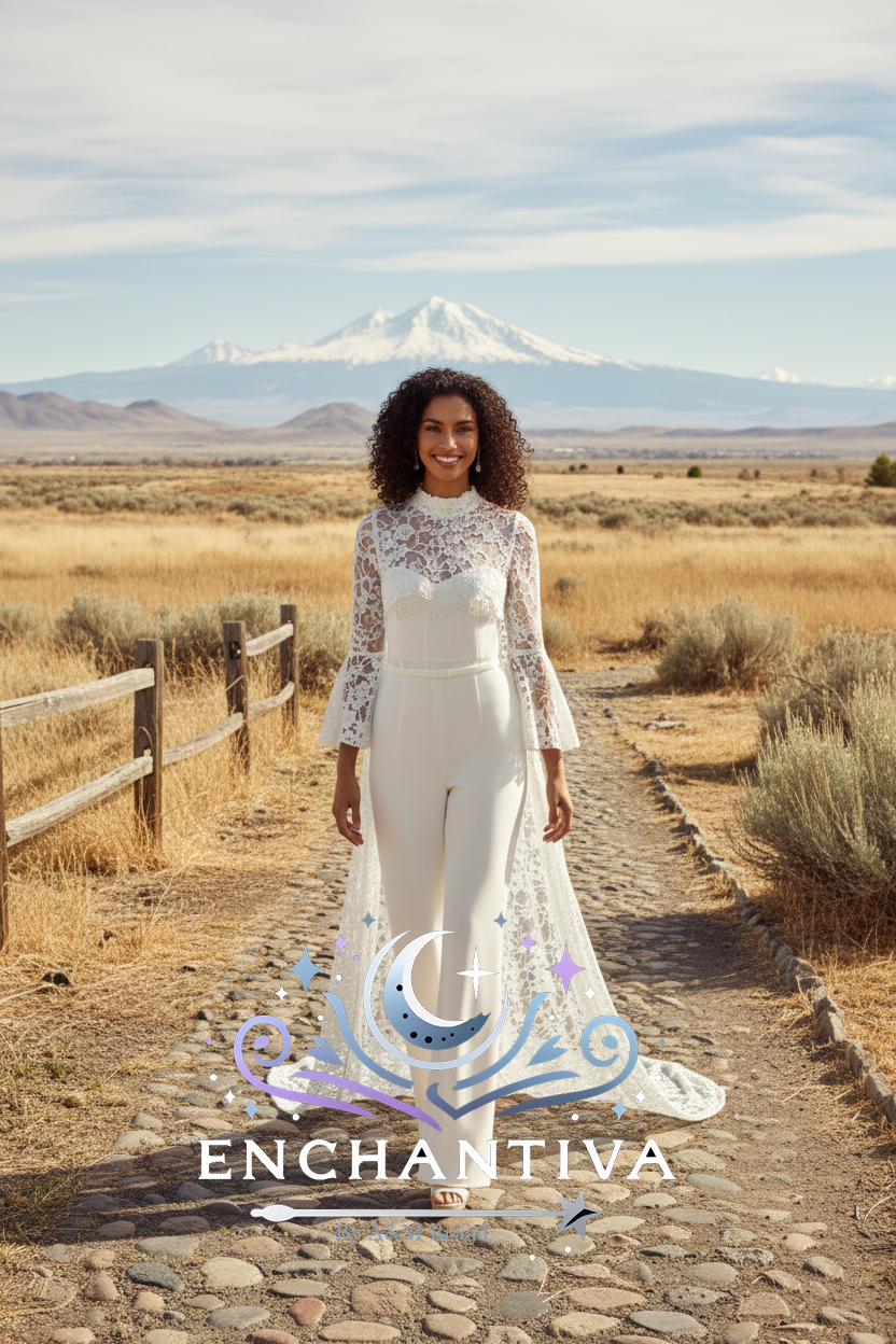 The lace overskirt features a flowing train and sheer, floral lace that moves beautifully with every step, creating a romantic, ethereal silhouette from the back. From the front, the look reveals a clean, tailored jumpsuit with long lace sleeves and a high neckline—offering elegance, comfort, and confidence all at once.