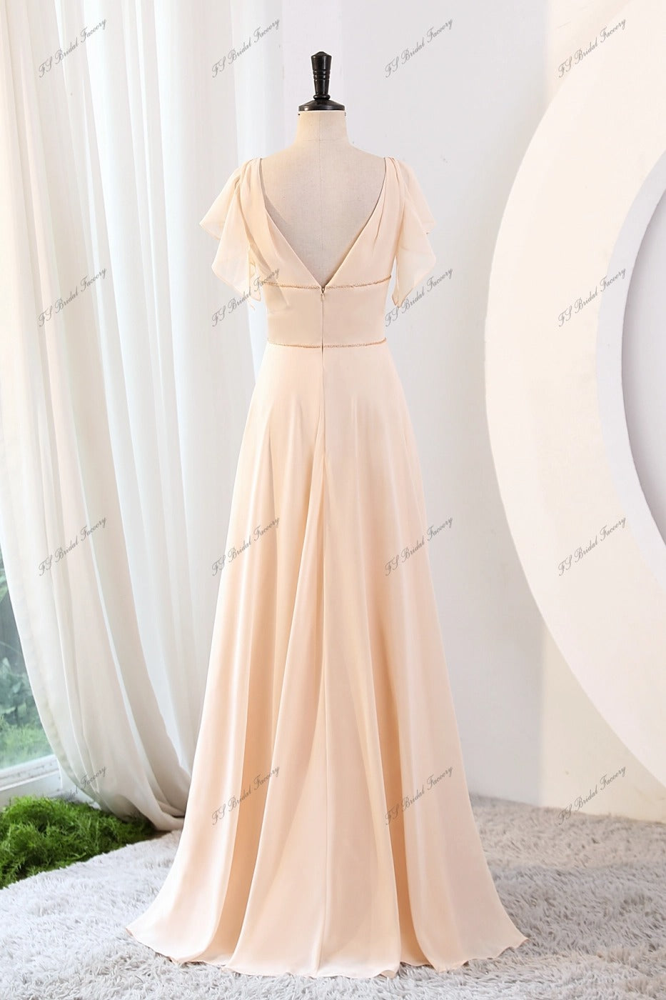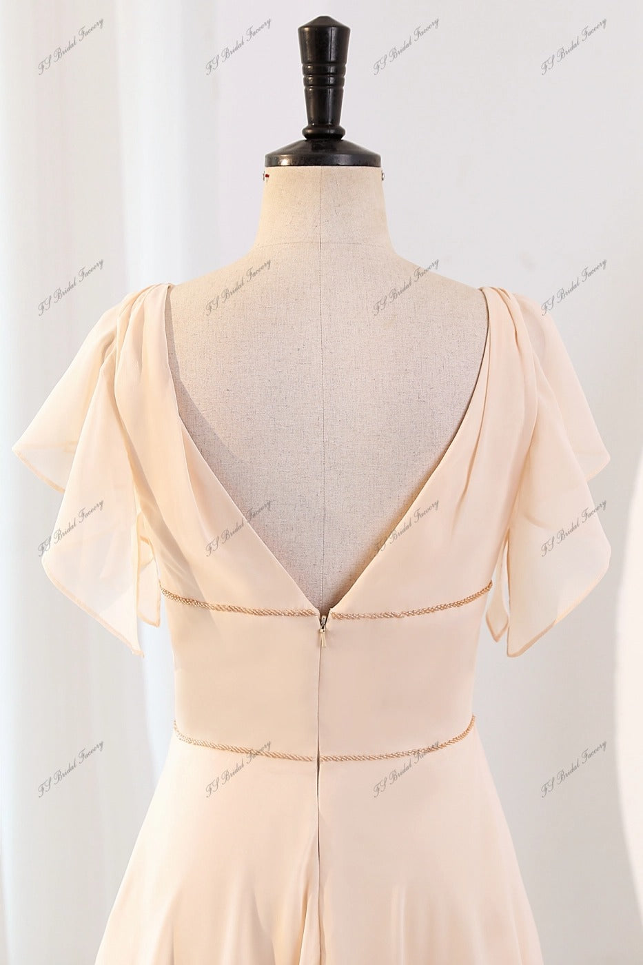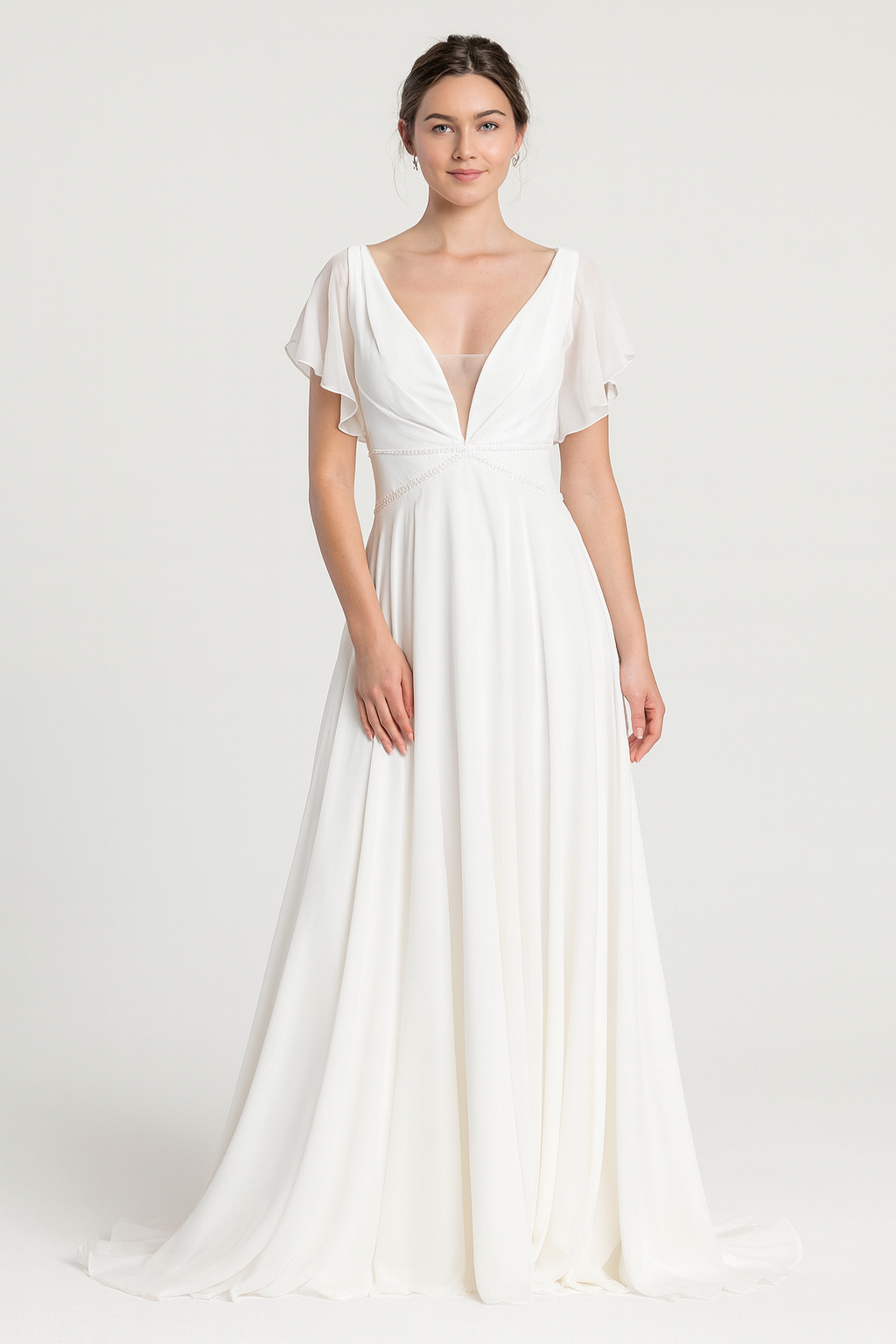 Effortless romance meets timeless elegance in our Valleigh wedding gown. This airy A-line chiffon dress features a soft plunging V-neckline framed by flutter sleeves and a delicate high waistband that flatters every silhouette. Designed with light, flowing layers for graceful movement, Valleigh is perfect for garden weddings, beach ceremonies, or classic indoor venues.