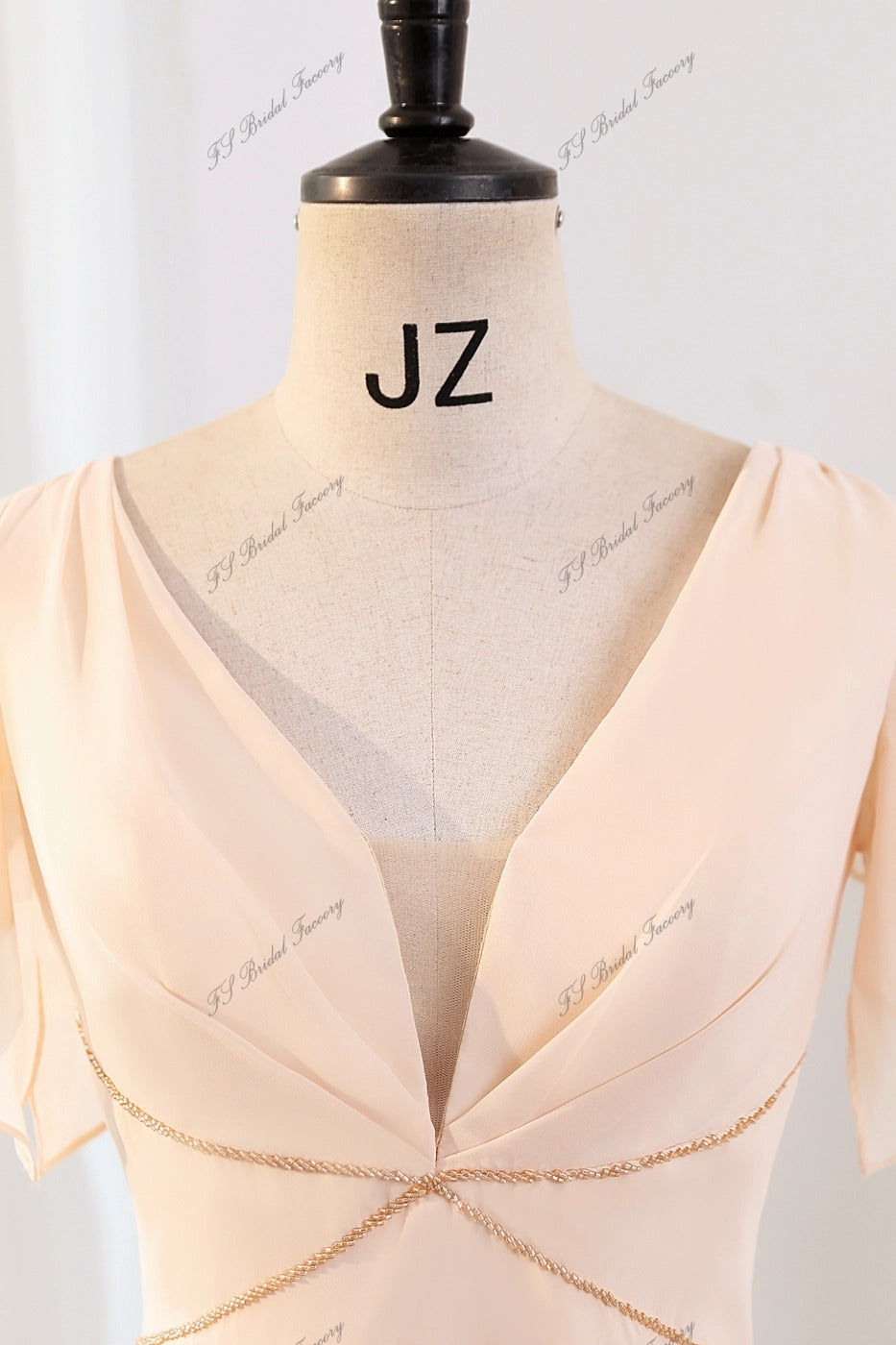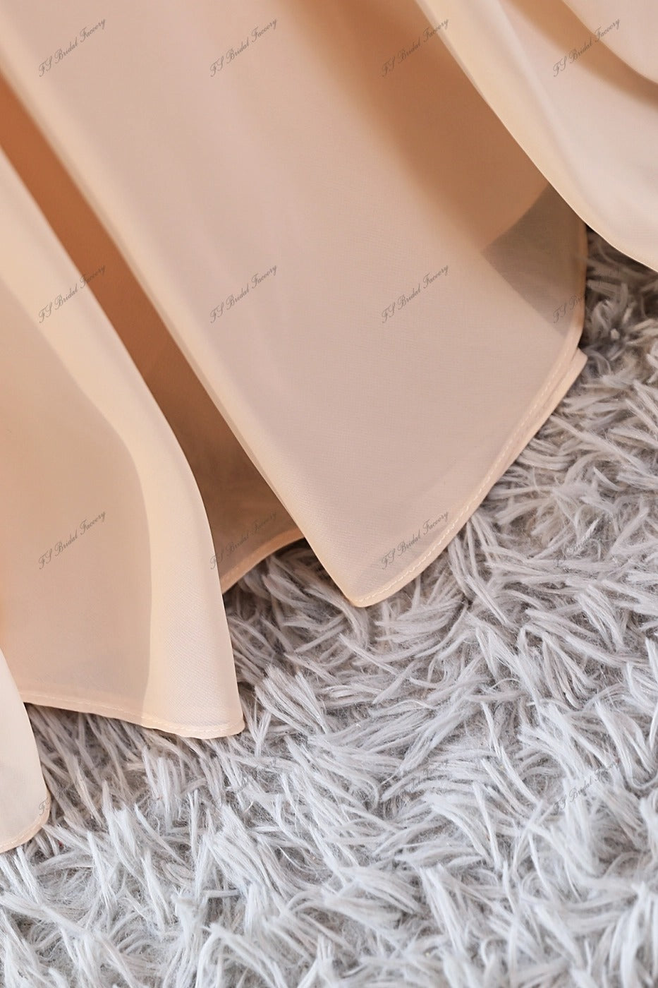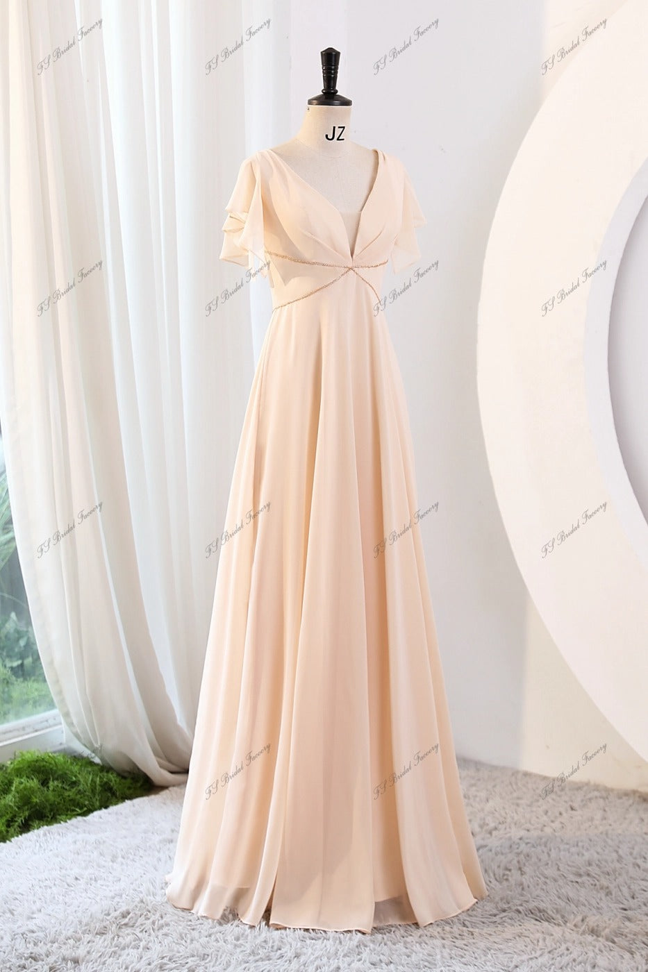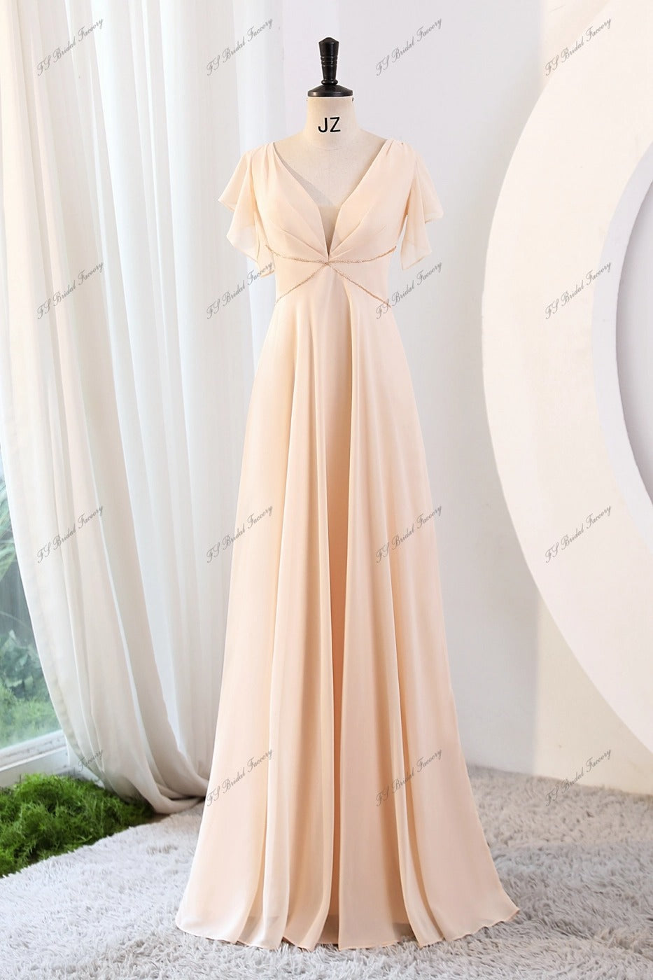 Effortless romance meets timeless elegance in our Valleigh wedding gown. This airy A-line chiffon dress features a soft plunging V-neckline framed by flutter sleeves and a delicate high waistband that flatters every silhouette. Designed with light, flowing layers for graceful movement, Valleigh is perfect for garden weddings, beach ceremonies, or classic indoor venues.