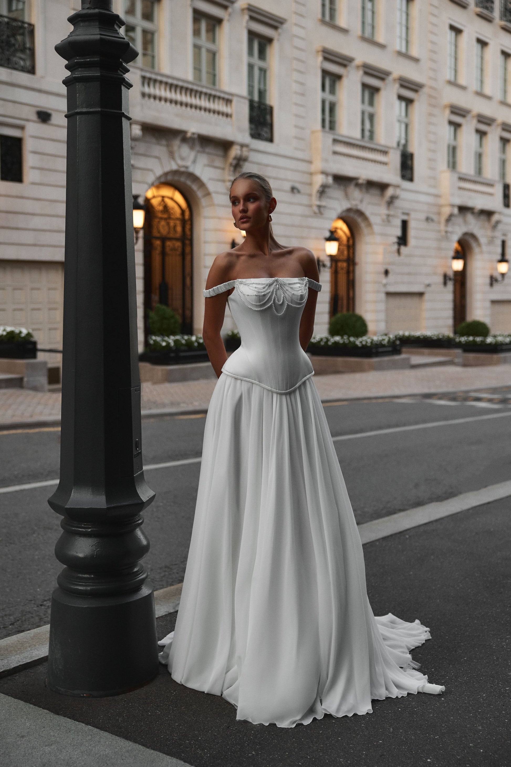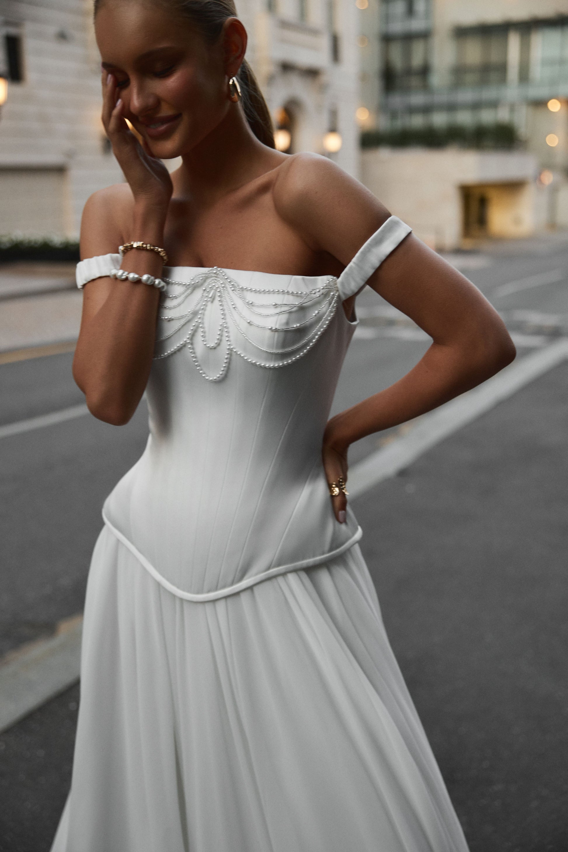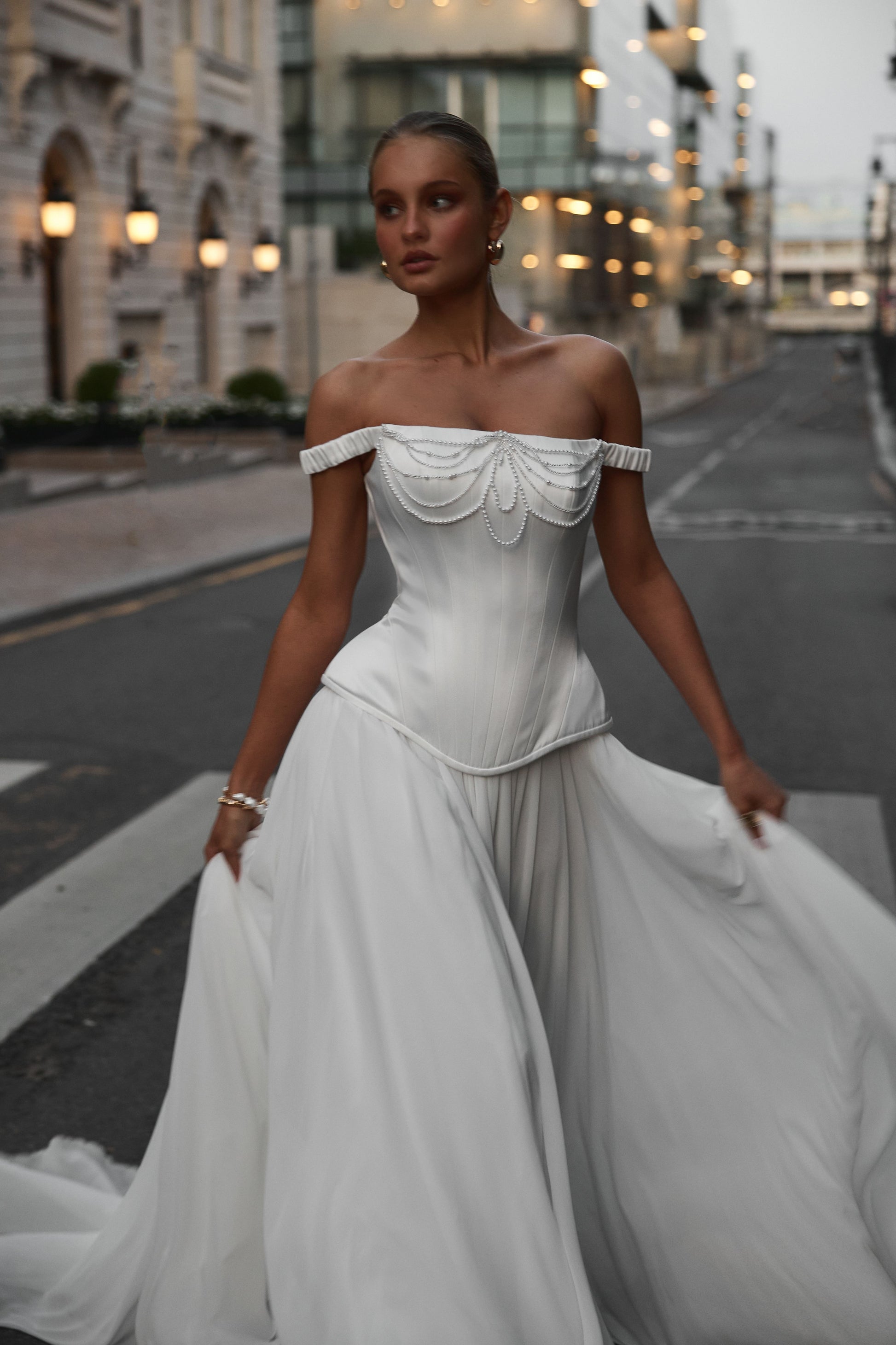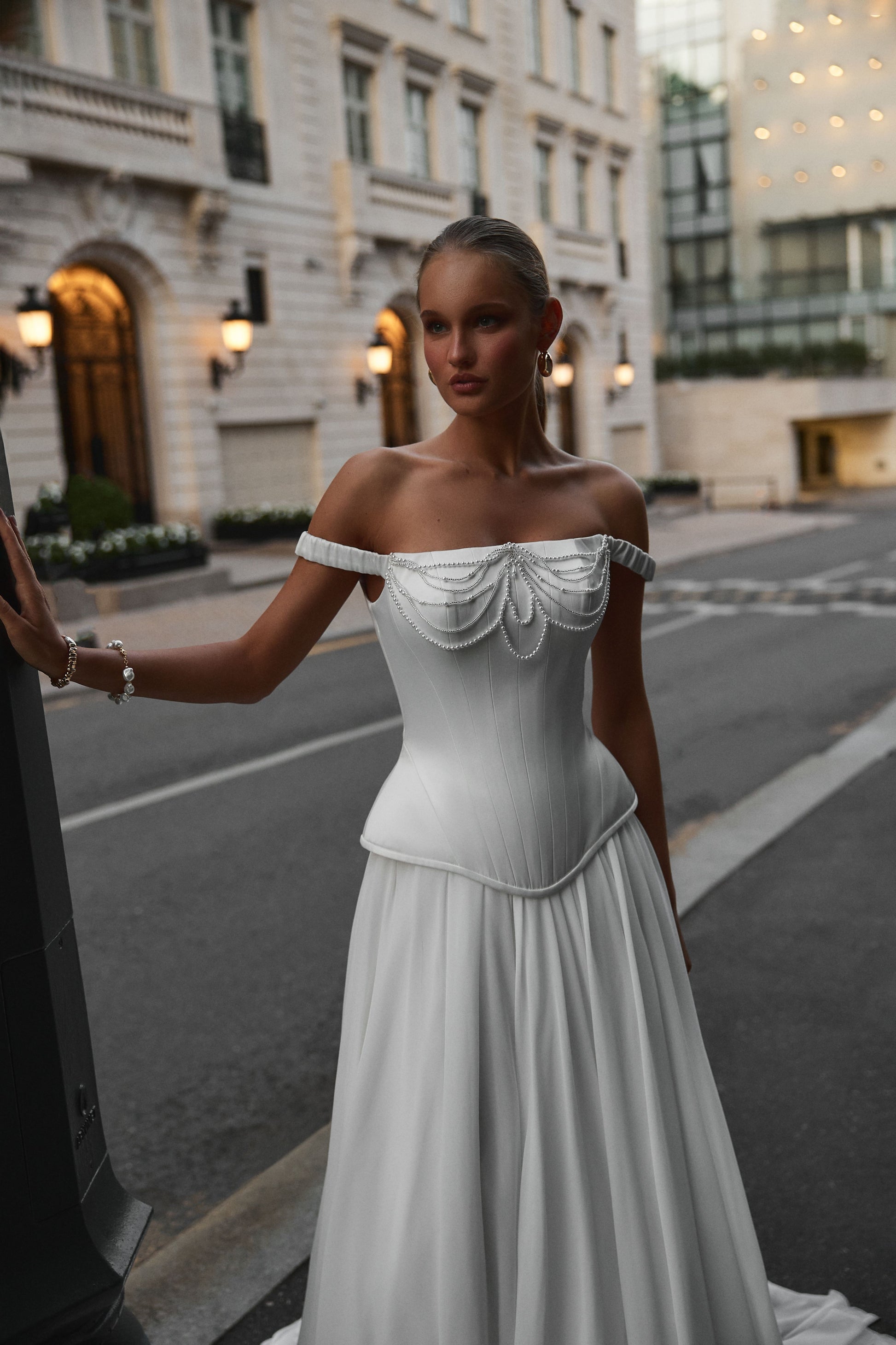 Effortless sophistication meets couture artistry in the Velmora gown by Sonya Soley, a Natalia Romanova company. Designed for the modern romantic, this captivating two-piece set features a sculpted off-the-shoulder corset bodice paired with a lightweight chiffon skirt that moves with dreamlike grace.