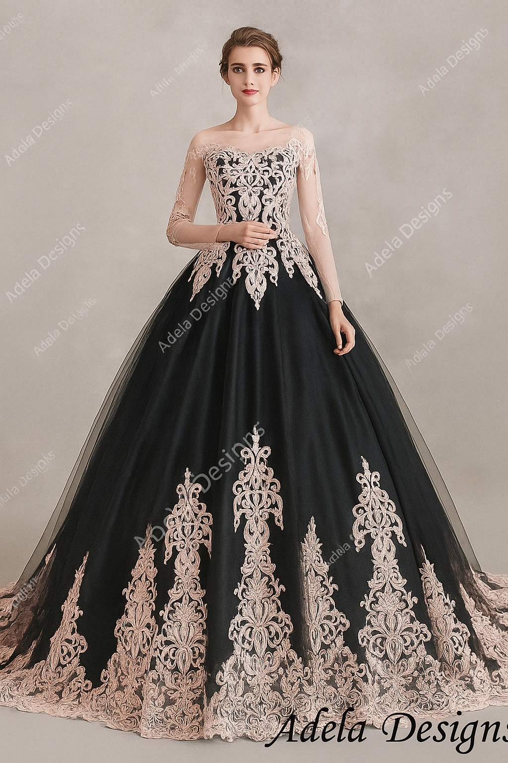 Available in bold black with champagne lace or golden peach with crisp white embroidery, Sophia gives brides the freedom to express individuality while maintaining a timeless silhouette. The full A-line skirt sweeps into a dramatic train, making every step feel like a royal procession.