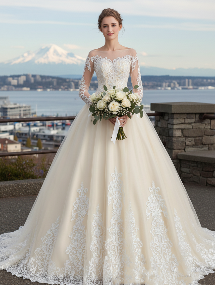 Sophia is a striking blend of old-world romance and modern sophistication. This long-sleeve ball gown from Adela Designs features a sheer illusion neckline and back, delicately adorned with embroidered lace that cascades across the bodice and frames the skirt in ornate baroque-inspired patterns.
