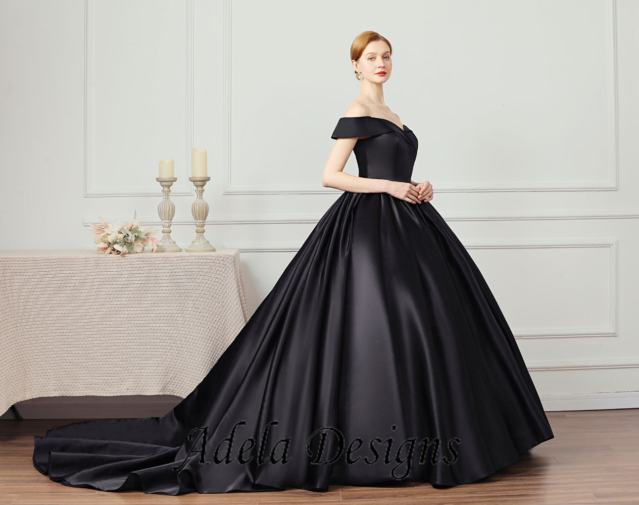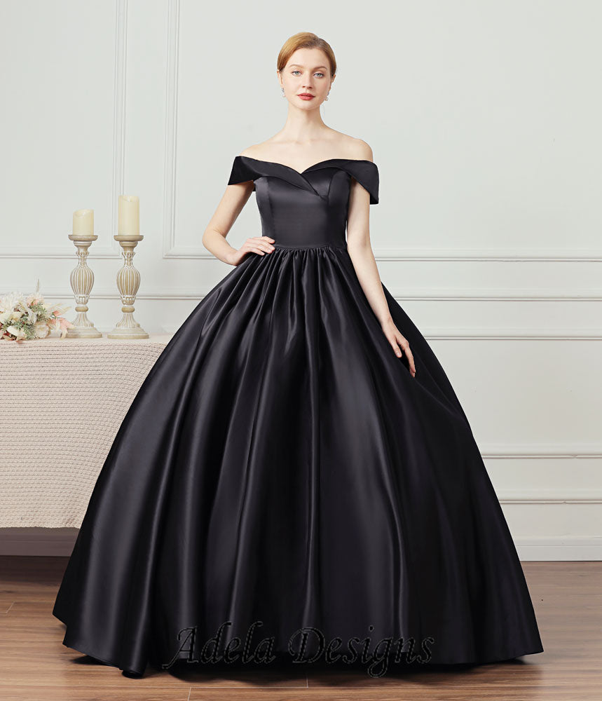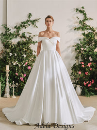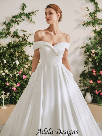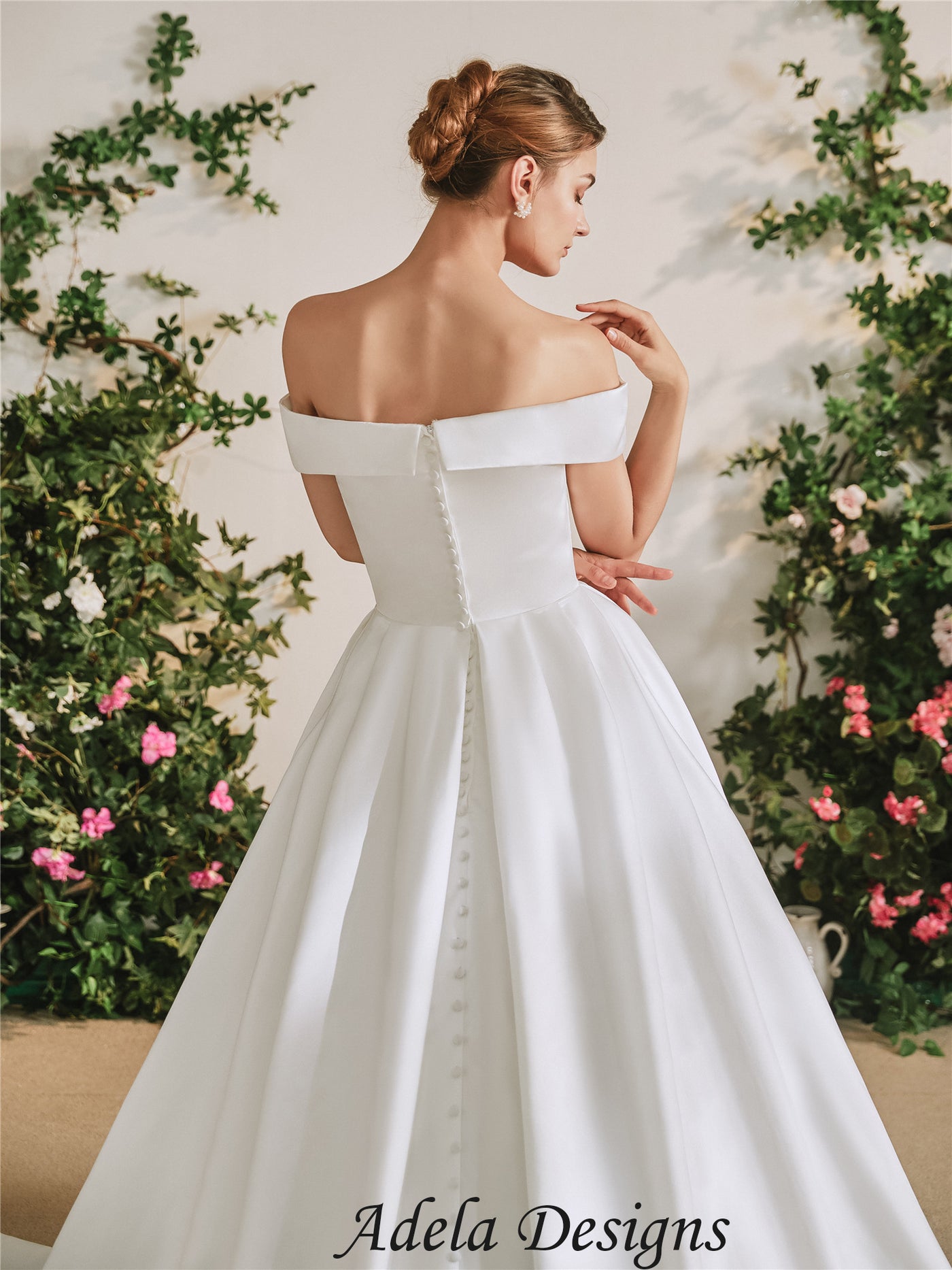 Timeless and elegant, the full A-Line Satin Skirt bridal gown features an ultra feminine off the shoulder neckline. The skirt is designed with side pockets.Covered buttons to the train hemline.