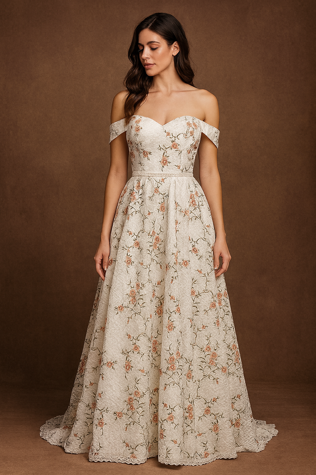 Keywords: floral wedding dress, lace wedding gown, off-the-shoulder bridal gown, boho wedding dress, rustic wedding gown, A-line wedding dress, embroidered wedding dress, romantic bridal gown, garden wedding dress, nature-inspired wedding dress, unique wedding gown.