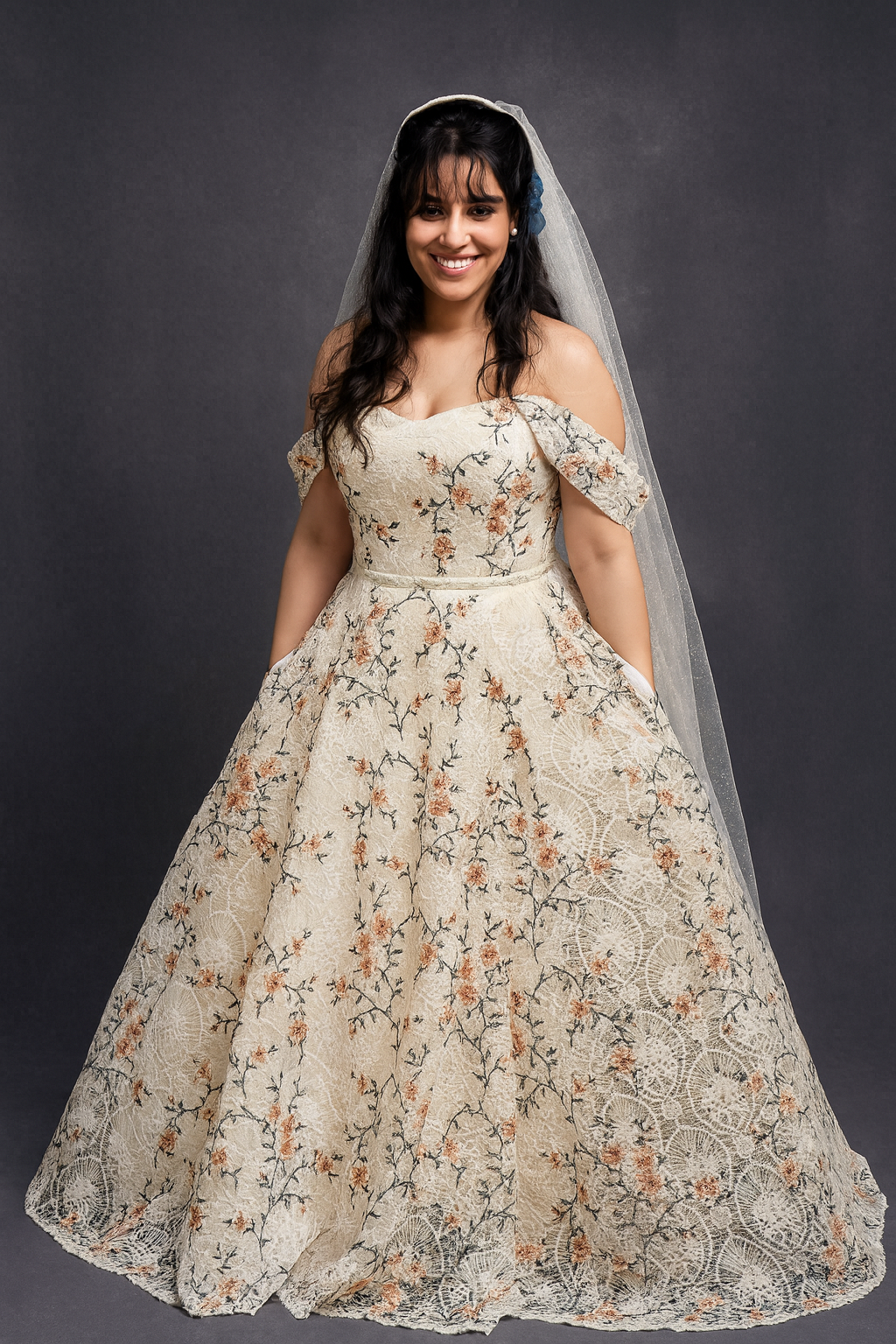 Wildflower Wedding Dress – The Wildflower gown is a romantic and bohemian dream, designed for free-spirited brides. Featuring an A-line silhouette, this enchanting dress is crafted with a delicate lace base and adorned with intricate floral embroidery in earthy tones of peach, pink, and green. The off-the-shoulder sleeves and sweetheart neckline create a soft, feminine look, while the corset-style back adds vintage-inspired charm. Perfect for outdoor, garden, or rustic weddings, the Wildflower gown offers timeless beauty with a touch of natural elegance, making it ideal for brides seeking a unique and unforgettable bridal look.